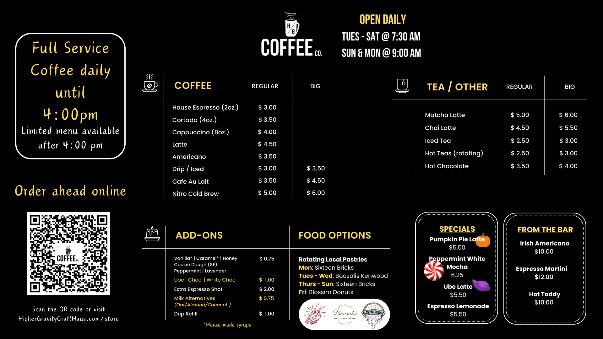 Check out our full menu below and be sure to follow us on our social media pages to stay up to date on all the new happenings around the coffee shop.