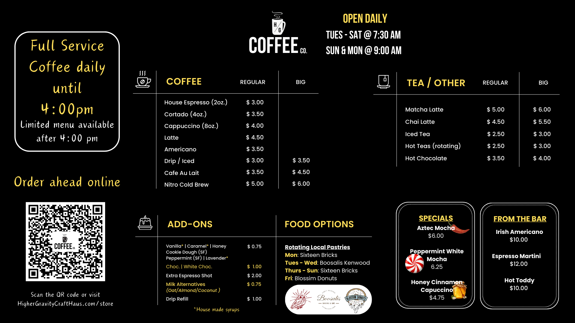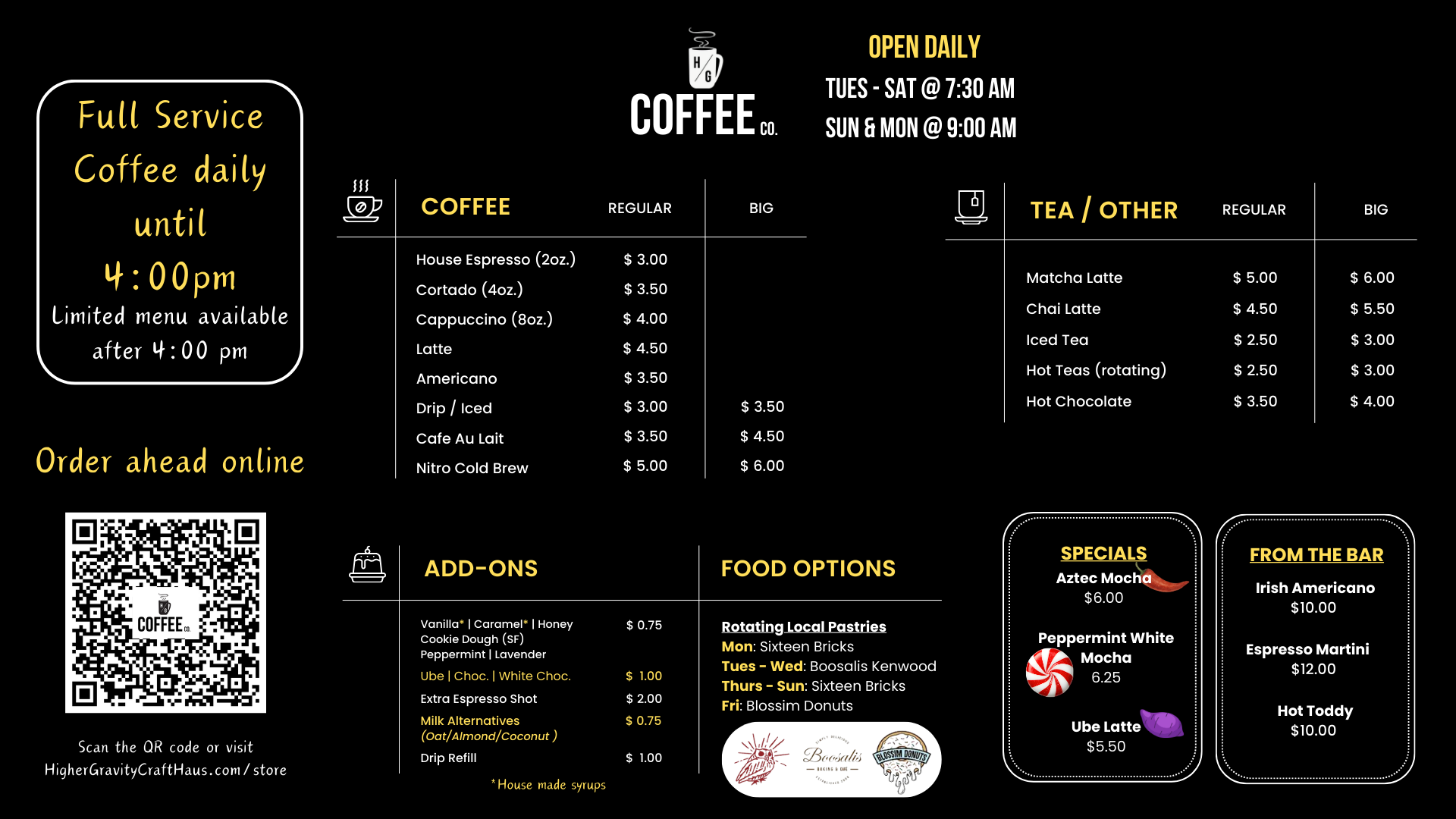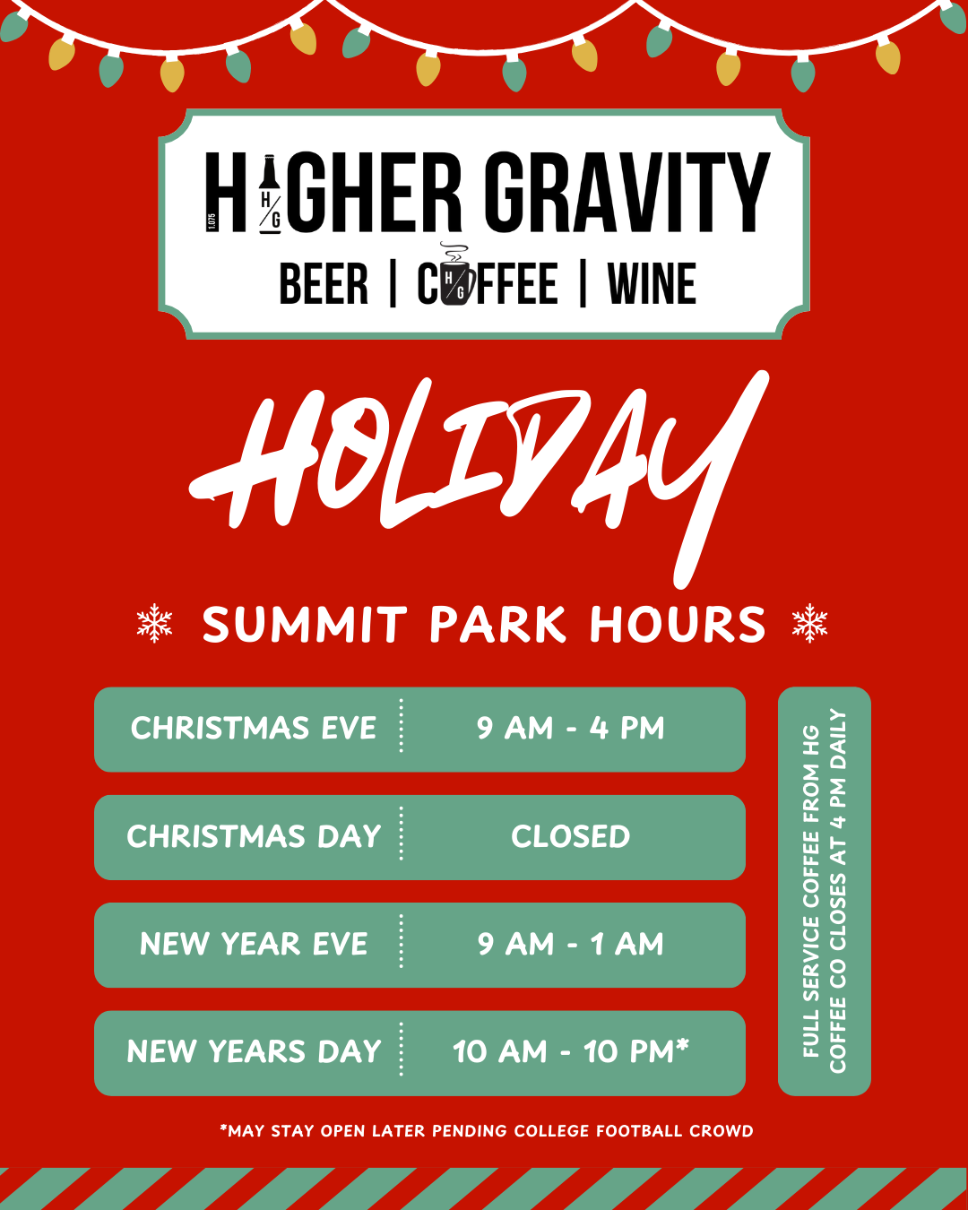 Check out our Special Hours at Higher Gravity Summit Park below. Please note that each day, full service Coffee will end at 4:00pm (as per usual)